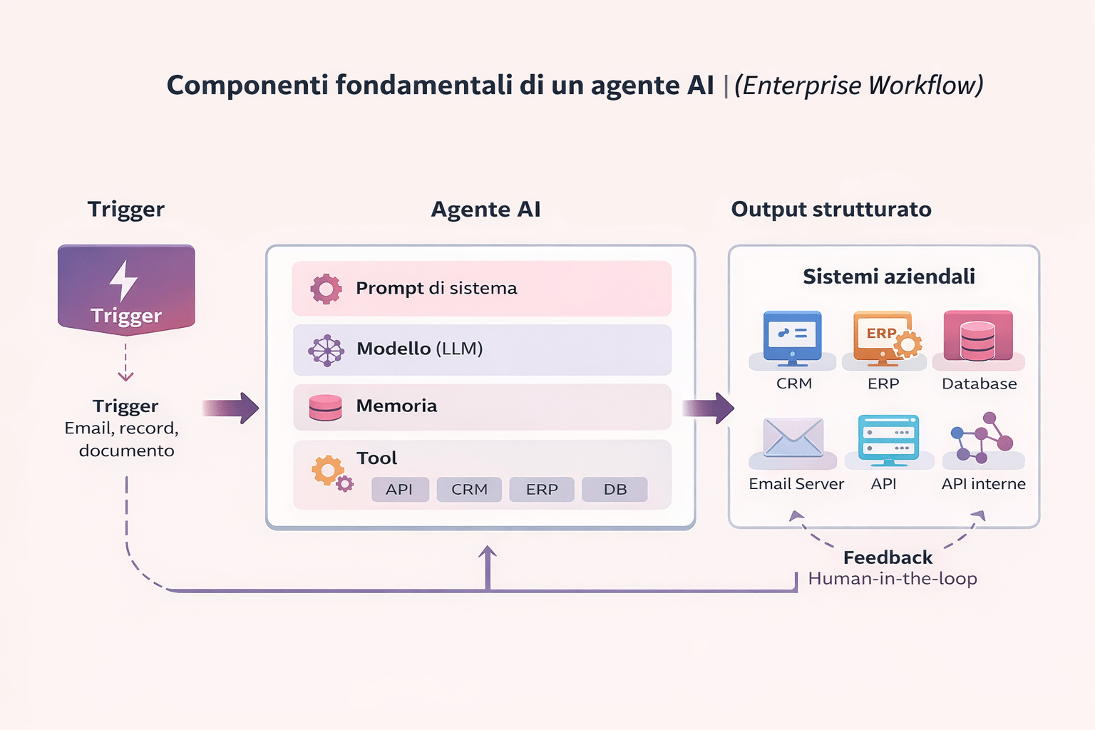 Output tipico | Testi, sintesi, idee, analisi ad hoc | Output operativo: aggiornamento sistemi, creazione task, compilazione campi, generazione documenti, notifiche |